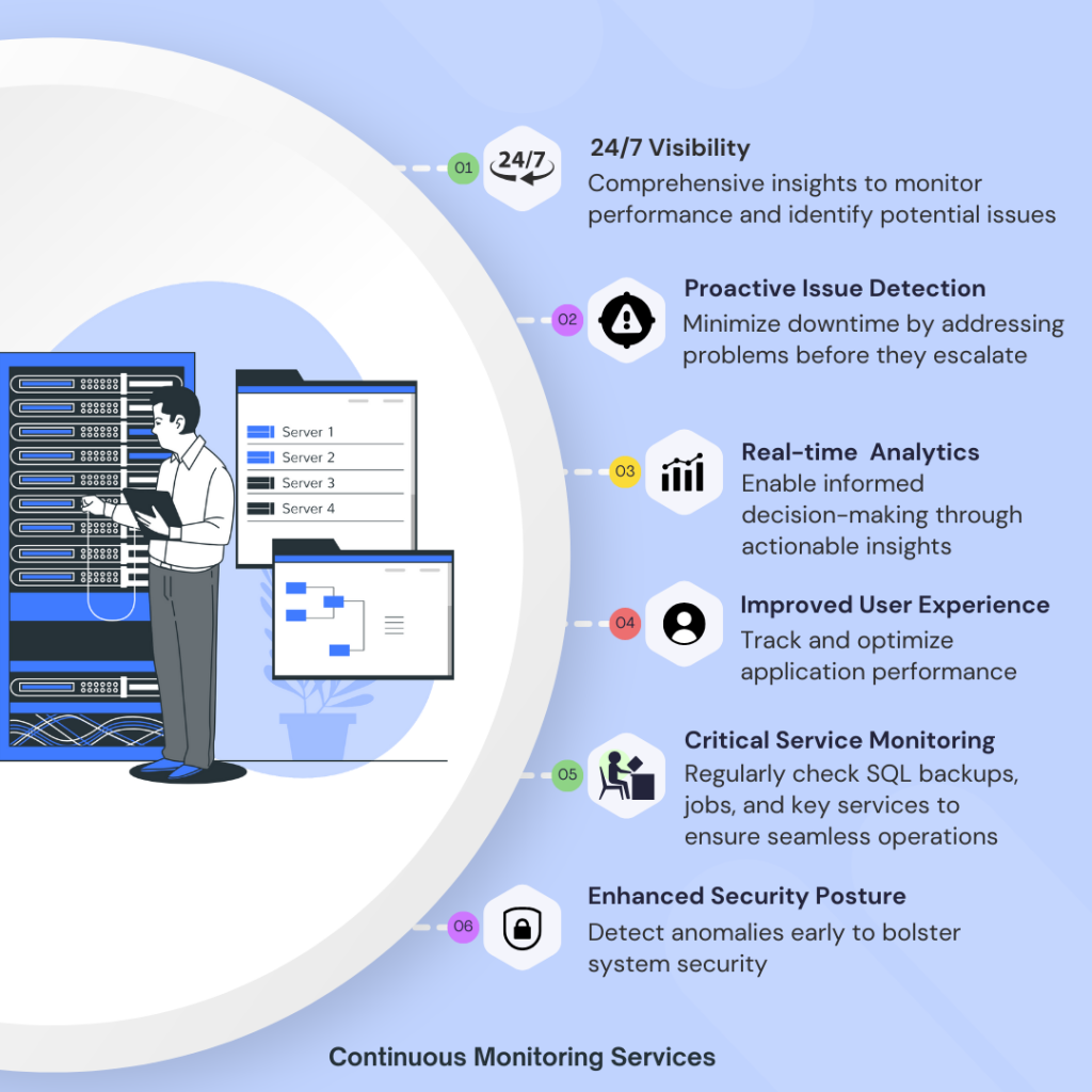 Staying ahead in IT means maintaining constant visibility into systems and applications. Our continuous monitoring services provide: